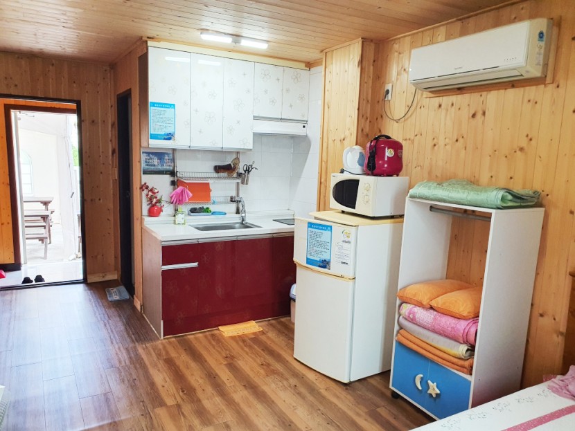 [비치용품]벽걸이TV, 냉장고, 싱크대, 전기밥솥, 전자렌지, 식기류, 와이파이 공유기, 에어컨, 테이블, 침구류, 드라이기 등