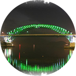 충무운하위에 당동, 보디섬, 미수동을 잇는 총연장 591m, 폭 20m의 강아치트러스공법과 프레이트거드 공법을 복합시켜 가설한 통영대교는 상판아취구간 140m에 푸른(green)계열 조명을 연출하는 투광등 196개를 설치하여, 밤이면 온화하고 포근한 푸른조명을 발산합니다.